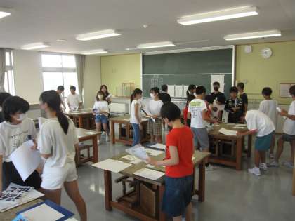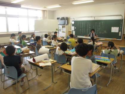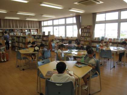夏休みの課題を手に、久しぶりに登校してきた子供たち。日焼けした顔には楽しかった夏の思い出が感じられます。課題を提出して、本を借りたり、応募作品を確認したりしました。