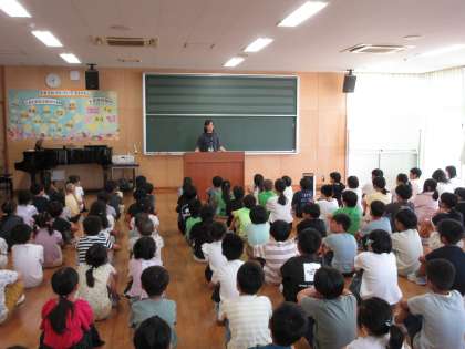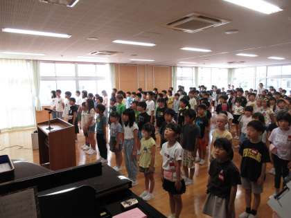 今日から2学期が始まりました。今日も暑さを考え、ランチルームで行いました。静かにしっかりと話を聞き、2学期への意欲を高めていました。
