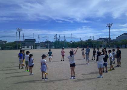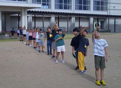 今日の理科の学習で、かげはどんなところにできるのかを調べました。太陽の位置とかげの位置を指差ししながら、きまりを見つけました。