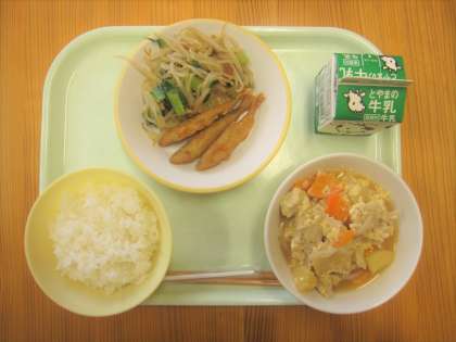 今日の給食は、ごはん、牛乳、わかさぎのフリッター、香味和え、高野豆腐の卵とじです。