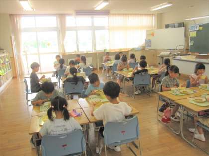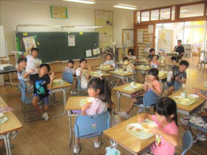 今日の給食は、ごはん、牛乳、わかさぎのフリッター、香味和え、高野豆腐の卵とじです。