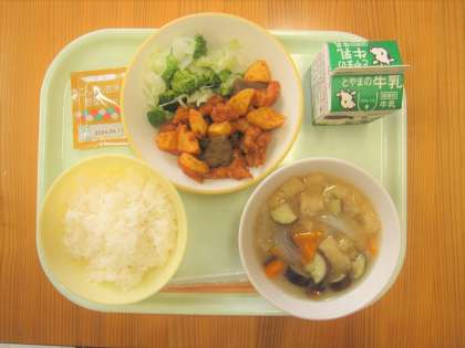 今日の給食は、ごはん、牛乳、鶏肉とレバーのケチャップからめ、添え野菜、なすのみそ汁、やさいふりかけです。
