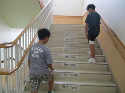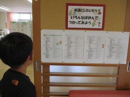 英語によるコミュニケーションを日常的に行うために、校内のいろいろな場所に英語を表示しています。朝は「Good morning!」、帰りは「See you」と挨拶する子も増えてきました。