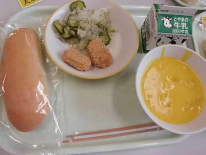 今日の給食は、コッパン・かぼちゃポタージュ・えごまドレッシングサラダ・チキンナゲット・牛乳です。今日は、富山県の山田地区のえごまが給食にでています。えごまといえば、食べると10年長生きできるという言い伝えがあるくらいに、体によい食材です!血液をさらさらにしてくれたり、病気を予防してくれたりと毎日意識してとっていきたい食材です。
