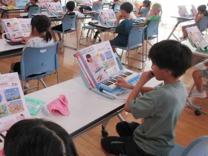 音楽科の授業で、子供たちが待ちに待った鍵盤ハーモニカの練習が始まりました。楽器を使うときの約束を確認し、音楽に合わせて一つの音をリズムよく鳴らしました。これから、どんな曲と出会い、どんな音をつないで演奏できるようになるのか、とても楽しみです。