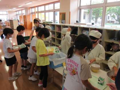 給食の時間は、エプロン隊のサポートをし、掃除の時間は、子供と共に長い自在ほうきで、きれいに掃いています。