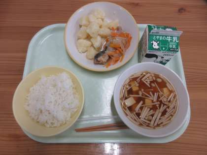 今日の給食は、ごはん、牛乳、ふくらぎのマリネ、こふきいも、すまし汁です。