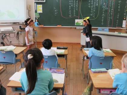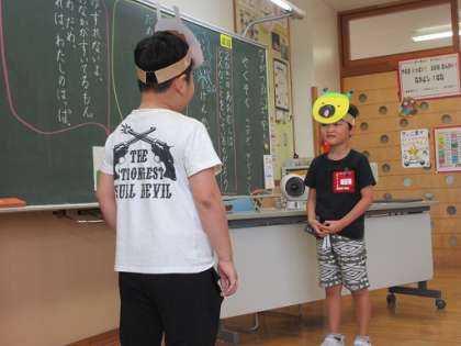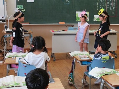 国語科の学習「やくそく」では、文章を読んで想像を広げ、登場人物のあおむしさんになって、会話を楽しみました。「これは、ぼくだけの葉っぱだから、食べないで!」と「大げんか」の様子を表現しました。