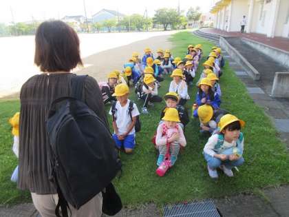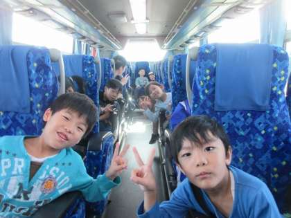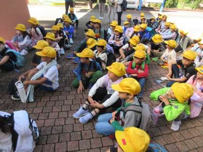 秋晴れに恵まれ、欠席0で遠足の日を迎えました。「始まりの式」では、校長先生から「たくさんの友達をつくってきましょう」と目当てを言われ、元気に返事をしていました。バスの中では、歌を歌ったり、クイズをしたりし、一時間があっという間でした。こどもみらい館の前で三校がそろい、いよいよ活動の始まりです。