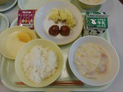 10月12日(木)の給食 公開日 2023/10/12 更新日 2023/10/12 学校からのお知らせ 今日の給食は、ごはん・牛乳・豆乳野菜スープ・チーズおさつ・ミートボール・柿・しそかつおふりかけです。