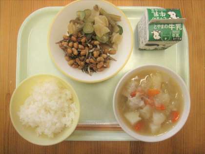 今日の給食は、ごはん、牛乳、小魚いりフライビーンズ、茎わかめのサラダ、ポトフです。