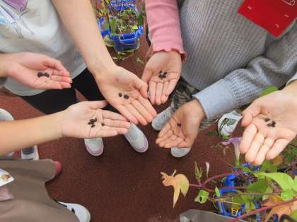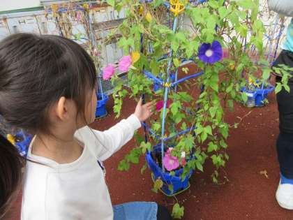 10月になり、朝夕の冷え込みが感じられる頃になりましたが、あさがおは、まだまだきれいな花を咲かせ、種ができています。最近、蛾?が卵を産みに来たり、幼虫が葉っぱの後ろに隠れていたりすることが、増えてきました。その度に対策を講じています。夏より、花も葉っぱも小さくなるものの、色は変わらず鮮やかで、もうしばらく大切にお世話をしようと決めました。