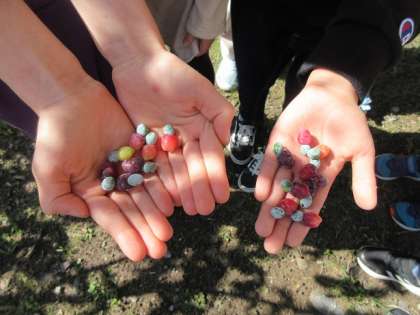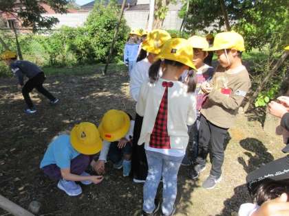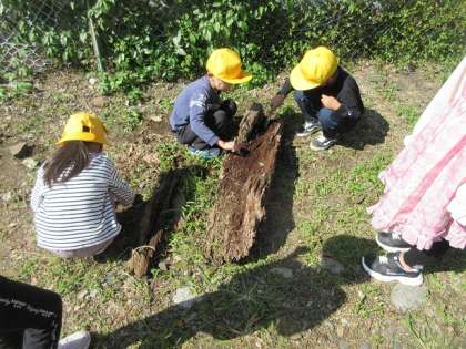 さわやかな秋晴れの日、みんなで学校の庭を秋を見付けに散策しました。普段入ったことのない場所もあり、甘い香りのキンモクセイや色とりどりの実を付けるまきの木、朽ちた木の幹の中にいる虫たち等、発見がいっぱいでした。紅葉は、もう少し時間がかかりそうですが、これからの秋見付けが楽しみです。