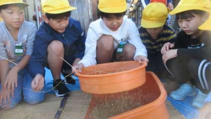 70年ほど前の道具を使って、脱穀の作業を体験しました。昔の人々の知恵や苦労を少しですが、感じることができたようです。また、春に植えた苗から、米を収穫できた喜びを共有し合っていました。