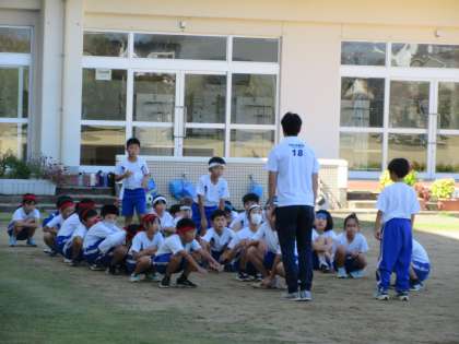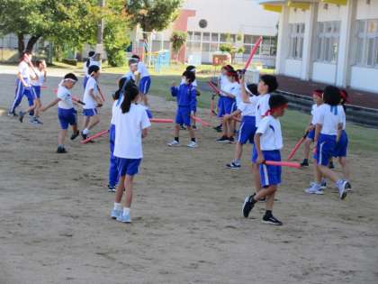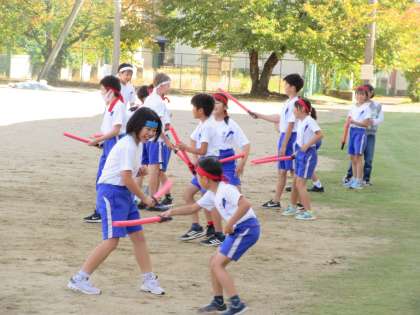 3時間目、体育の時間に4年生がスポーツチャンバラをしているところです。2人一組になり、柔らかい剣で相手の体のどこかにタッチできれば勝ちです。互いに駆け引きをしながら楽しんでいました。