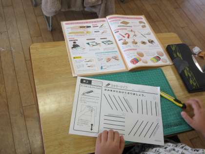 カッターナイフの正しい使い方について学びました。使わないときは必ず刃を引っ込めること、切る線が上から下向きになるように紙の向きを変えることを意識して取り組んでいました。紙の押さえ方も考えながら注意深くカッターナイフを使っていました。