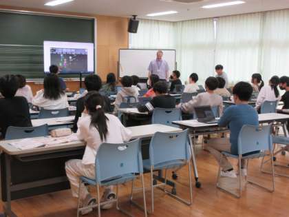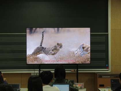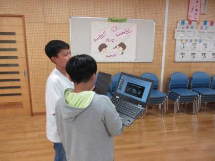 各自、自分が好きな動物を1つ選びタブレットに画像を載せて友達に紹介していました。友達がそれを見て、どこに住んでいるのか何を食べるのか英語で聞き、住んでいる場所や食べ物等をタブレット画像を見せて答えていました。