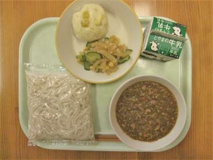 今日の給食は、ソフト麺のカレーソース、蒸しパン、大根サラダです。