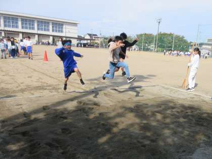 「跳」では走り幅跳びに取り組みました。高学年が思い切り高く跳んでいるのを見て、下級生は、「あんなふうに高く跳びたいな」「もっと練習しよう」とつぶやいていました。ファミリーで活動することで、一人一人が目当てをもって取り組んでいました。