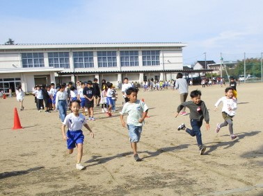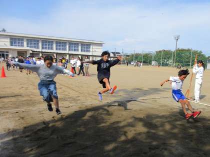「跳」では走り幅跳びに取り組みました。高学年が思い切り高く跳んでいるのを見て、下級生は、「あんなふうに高く跳びたいな」「もっと練習しよう」とつぶやいていました。ファミリーで活動することで、一人一人が目当てをもって取り組んでいました。