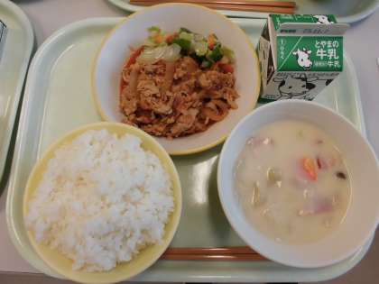 今日の給食は、ごはん・牛乳・秋の香りシチュー・アスパラサラダ・ポークチャップです。