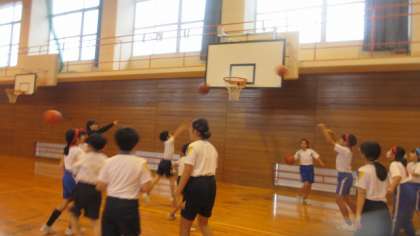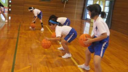 グラウジーズから4名のコーチをお招きして、バスケットボール教室を行いました。ウォーミングアップやパス、ドリブルなどに分かれて練習した後、シュートゲームを行いました。水橋西部小学校の5年生ともパスをしたり、話したりする様子が見られました。