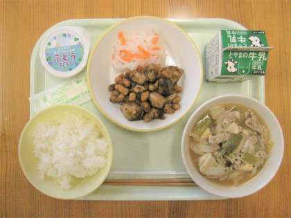 今日は「学校給食とやまの日」の献立です。ごはん、牛乳、おすわい、魚と大豆のえごまからめ、とやまのみぞ野菜なべ、海洋深層水ゼリーです。