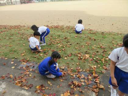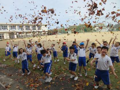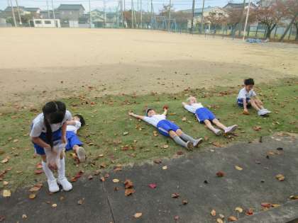 教室横のベランダ側に、たくさんの落ち葉が集まりました。子供たちは、落ち葉の上で寝転んだり、たくさん集めて一斉に投げ上げ、落ち葉のシャワーを浴びたりして楽しみました。