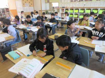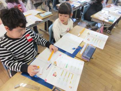 算数科の学習で、繰り上がりのたし算の方法を、ブロックを使いながらペアの友達に伝え合いました。自分の考えと同じかどうか、確かめながら一生懸命聞き入っていました。
