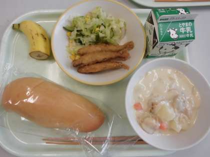 11月16日(木)の給食 公開日 2023/11/16 更新日 2023/11/16 活動の様子 今日の給食は、こめこコッペパン・牛乳・クラムチャウダー・コールスローサラダ・わかさぎのフリッター・バナナです。