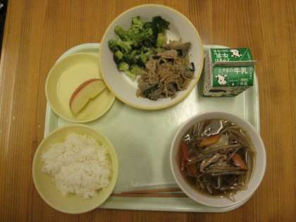 今日の給食は、ごはん、牛乳、スタミナレバー丼、ゆでブロッコリー、ワンタンスープ、りんごです。