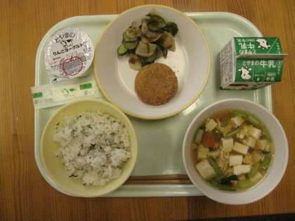 「学校給食とやまの日」の献立でした。県産の食材を豊富に使用した献立です。菜めし、牛乳、とやまミートコロッケ、とろろ昆布和え、かき玉汁、りんごヨーグルトです。おいしくいただきました。
