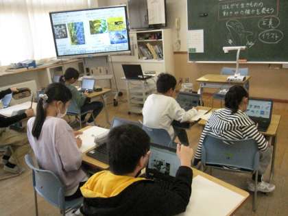 版画の下絵をかいていました。題材は生き物のようです。クロムブックで調べながら何をかこうか考えています。
