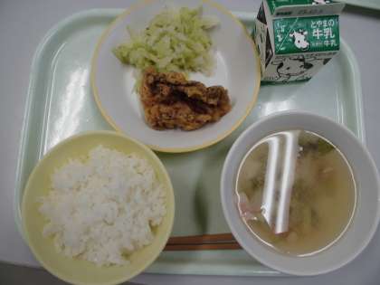 今日の給食は、ごはん・牛乳・ゆでキャベツ・ポークパコラ・かぶのスープです。
