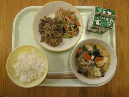 今日の給食は、ごはんビビンバ(焼き肉・ナムル)、みそ汁です。
