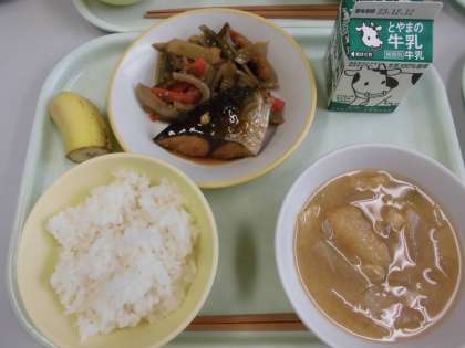 きょうの給食は、ごはん・牛乳・具だくさん汁・茎わかめのきんぴら・ふくらぎのてりやき・バナナです。