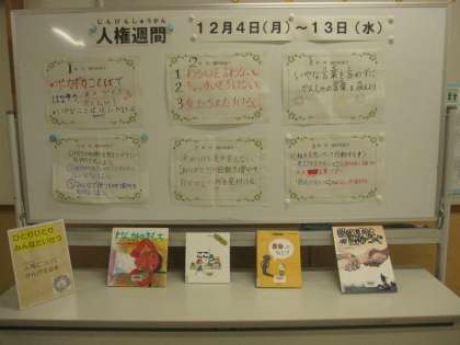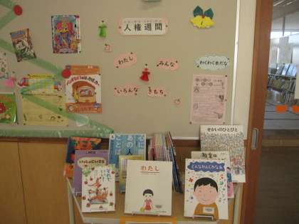 今週は人権週間です。職員室前には、各学年の目当てを掲示し、みんなで声を掛け合い、取り組んでいます。また、人権に関する本が紹介されています。この機会にぜひ借りて読んでみましょう。