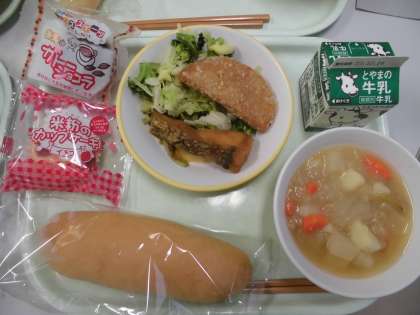 今日の給食は、コッペパン・牛乳・ポトフ・そえやさい・揚げ魚のレモン味またはハムカツ・いちごのカップケーキまたはガトーショコラです。今日の給食は、選択献立でした!