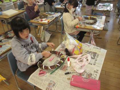 生活科であさがおのつるでつくったリースに飾りを付けていました。仕上がりが楽しみです。