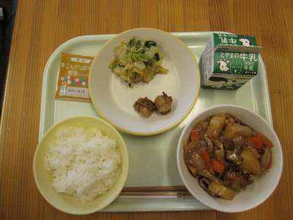 今日の給食は、ごはん、牛乳、ほたての香味焼き、生姜びたし、酢豚、野菜ふりかけです。