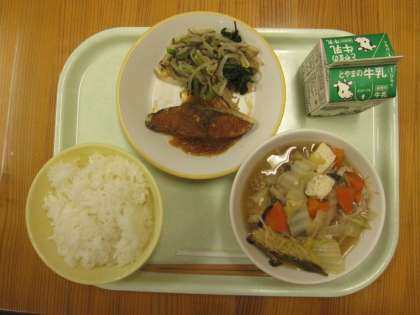 今日の給食は、ごはん、牛乳、白菜鍋、揚げ魚のみぞれだれ、昆布和えです。