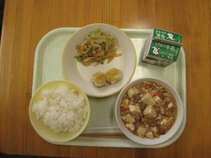 今日の給食は、ごはん、牛乳、マーボー豆腐、にんじんシューマイ、大根ナムルです。