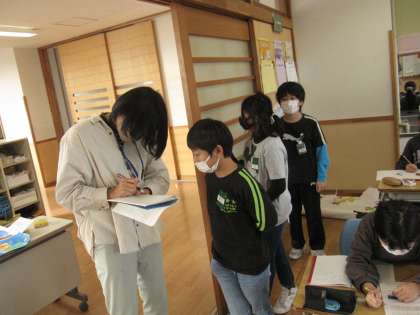 黒板に「算数道場」と書かれていました。自分たちで問題をつくって友達に解いてもらっていました。先生に確認してもらっています。