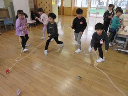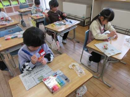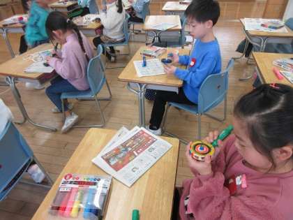 図画工作科の授業で、木でできたこまに自分の好きな色を塗ったり模様を描いたりしました。作品ができ上がると、今度は、友達と「誰が一番長く回るか」と競って遊びました。初めてこま回しをする子供は、友達に紐の巻き方を教えてもらい、回す練習をしていました。つくって、遊んで、工夫して、とても楽しい時間を過ごしました。