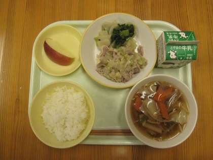 今日の給食は、ごはん、牛乳、豚肉の塩こうじ炒め、かぶの色どり、ワンタンスープ、りんごです。