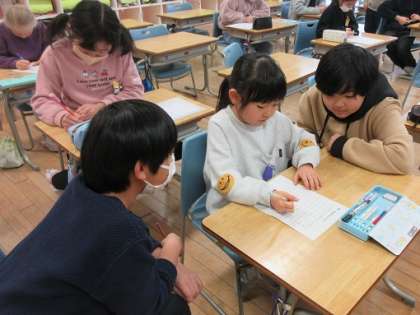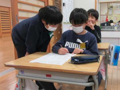 今日のファミリータイムは、一人一人が課題をもってファミリーごとに集まり、20分間課題に取り組みました。最初は、それぞれ自分の課題に向かって集中して取り組んでいました。次第に、下級生が上級生に教えてもらったり、九九の問題を出してもらったり、仕上げた課題の答え合わせをしてもらったりするなど、温かい雰囲気の中、学習を進めていました。今後もこのようなファミリー活動を行っていく予定です。