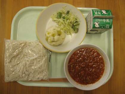 1月19日(金)の給食 公開日 2024/01/19 更新日 2024/01/19 活動の様子 今日の給食は、ソフト麺のミートソースかけ、蒸しパン、グリーンサラダです。 今日もおいしくいただきました。来週は給食週間です。