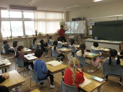 国語では、「たぬきの糸車」を学習しています。昔話なので、「糸車」や「糸を紡ぐ」という言葉が難しいようです。糸車の画像を見せて、お話のイメージを膨らませていました。