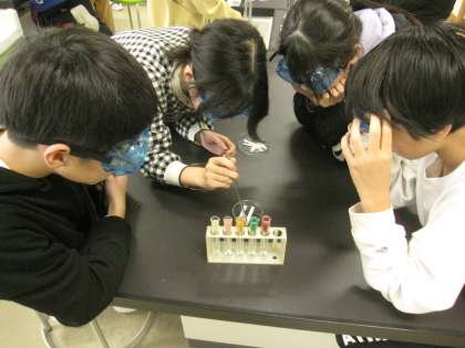 理科の学習です。保護めがねをかけ、リトマス紙を使って実験しています。さあ色が変わったでしょうか。