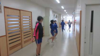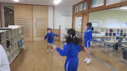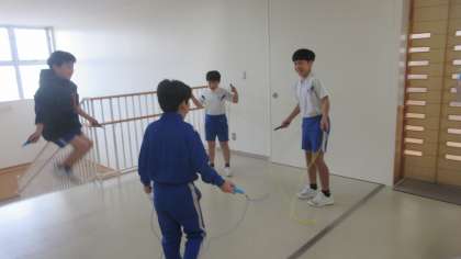 短なわとびをやっています。友達同士で声をかけ合いながら、楽しそうに行っていました。